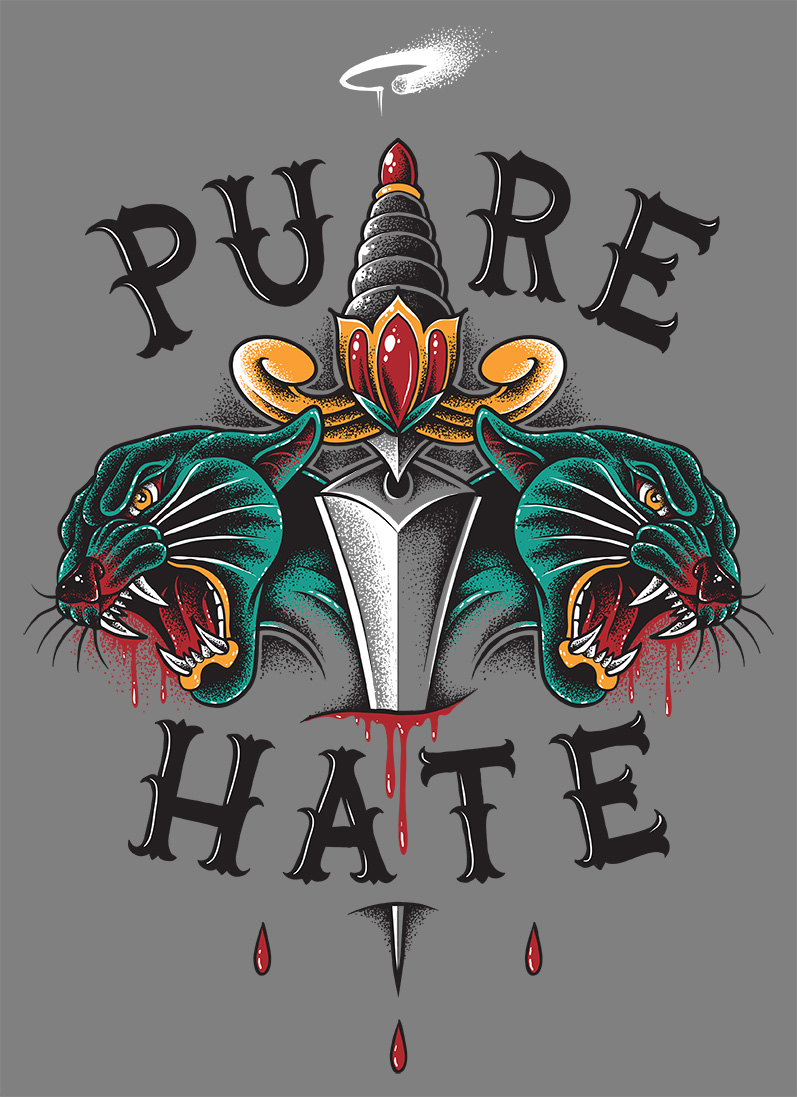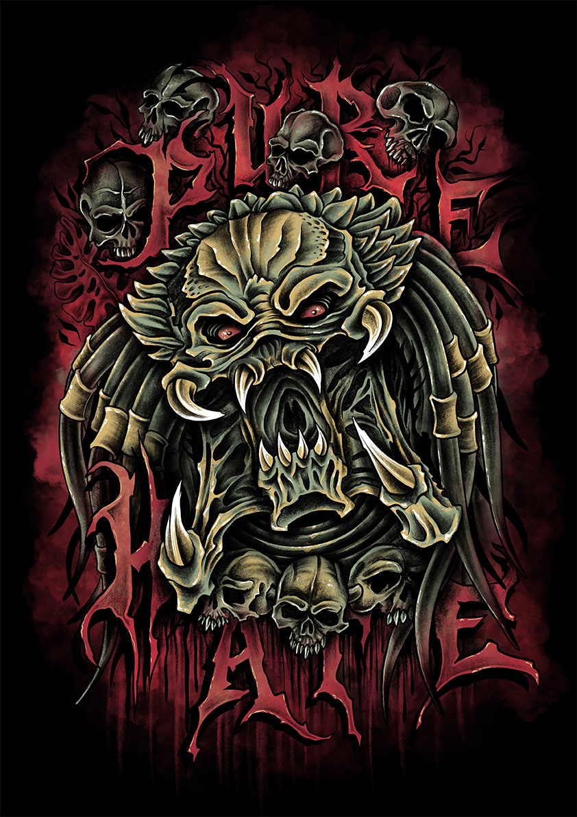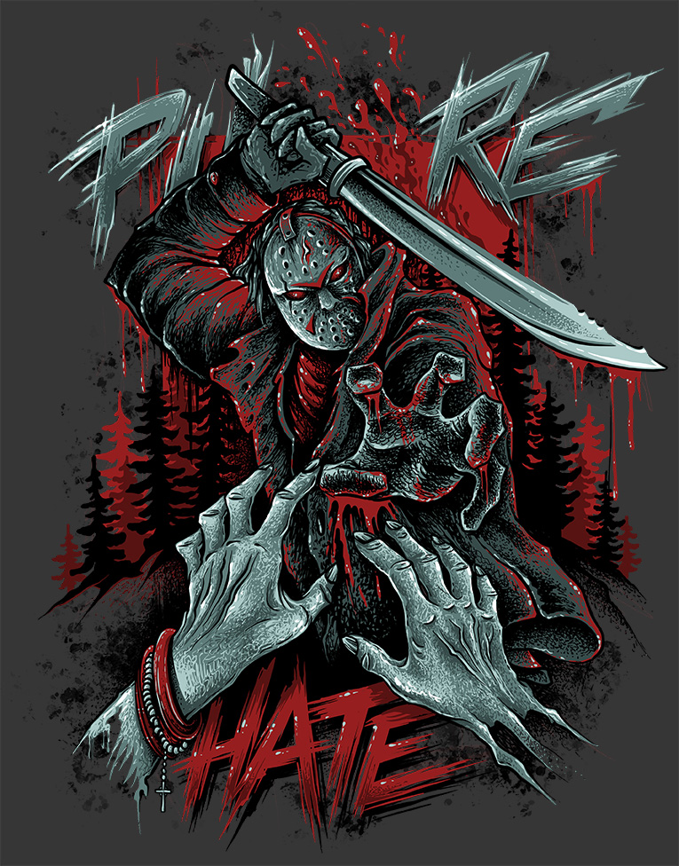 During the past years I did a bunch of shirt designs for the wellknown German Streetwear Label PURE HATE. Some classic oldschool designs and some detailled horror-themed designs. Always a pleasure and fun to work with Philipp from Pure Hate. All modelphotos are made by Pivopix. Thanks for let me being part of this project!